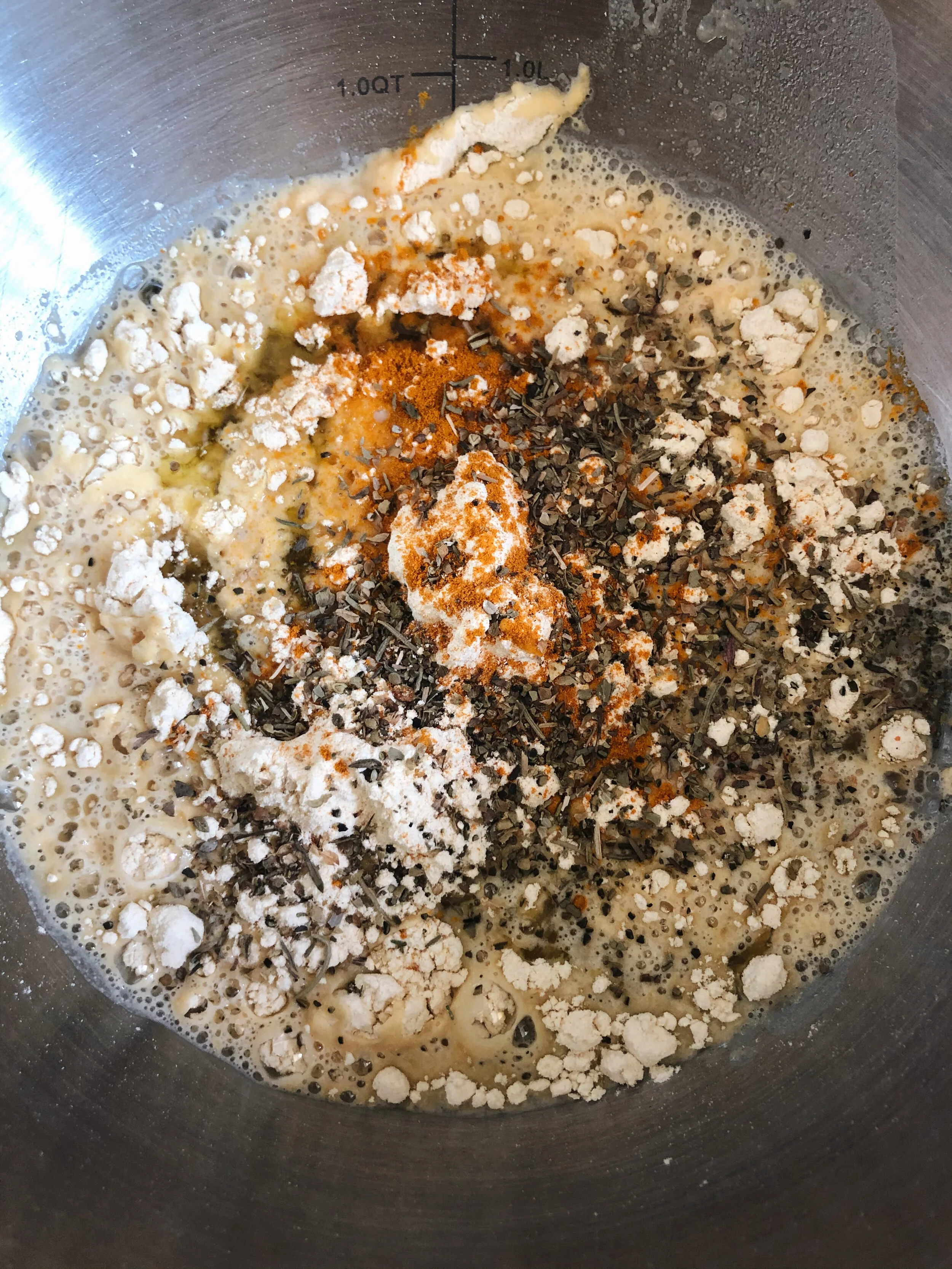 Whisk together flour, nutritional yeast, water, milk, oil, and dry seasonings in a large bowl. Your batter will be quite wet, but all is well!